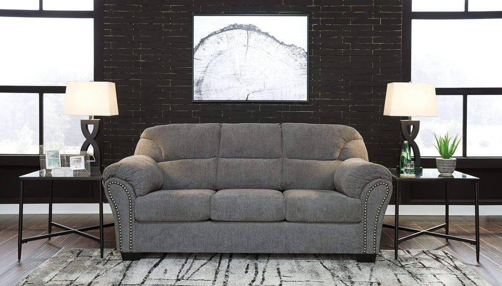 Why sacrifice comfort for style (or style for comfort) when you can have the best of both in this sofa in pewter gray. Elements include a chic divided-back design and pillow top wrapped armrests that make nodding off all too easy. Calling attention to the elegantly flared armrests—black nickel-tone nailhead trim for a punch of cool character.